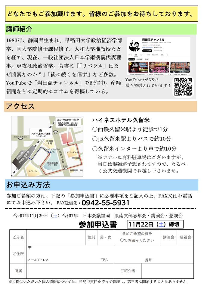 - 令和7年11月29日(土) 講演会15時開会 懇親会17時開会