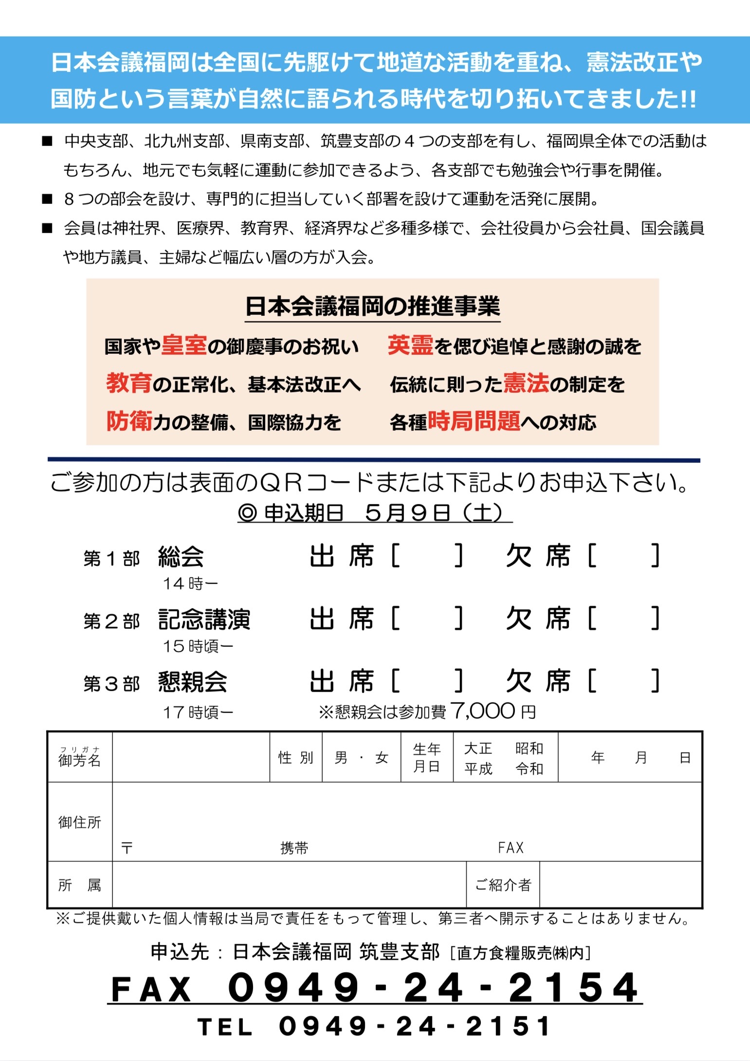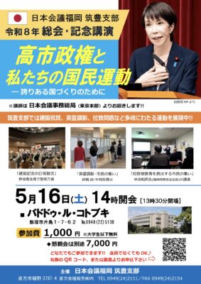 日本会議福岡 筑豊支部 令和8年 総会・記念公演筑豊支部 学生無料 講師紹介日本会議事務総局〔東京本部〕よりお招きします。行事概要日時令和8年5月14日(土)14時開会会場 パドドゥ・ル・コトブキGoogleMapはこちら参加費1,000円主催日本会議福岡筑豊支部講師日本会議事務総局〔東京本部〕よりお招きします。演題高市政権と私たちの国民運動 行事のチラシはこちら(PDF)お申し込み方法 Googleフォームでのお申し込み スマートフォン読み取り用のQRコードはこちら 閉じる 用紙でのお申し込み 閉じる
