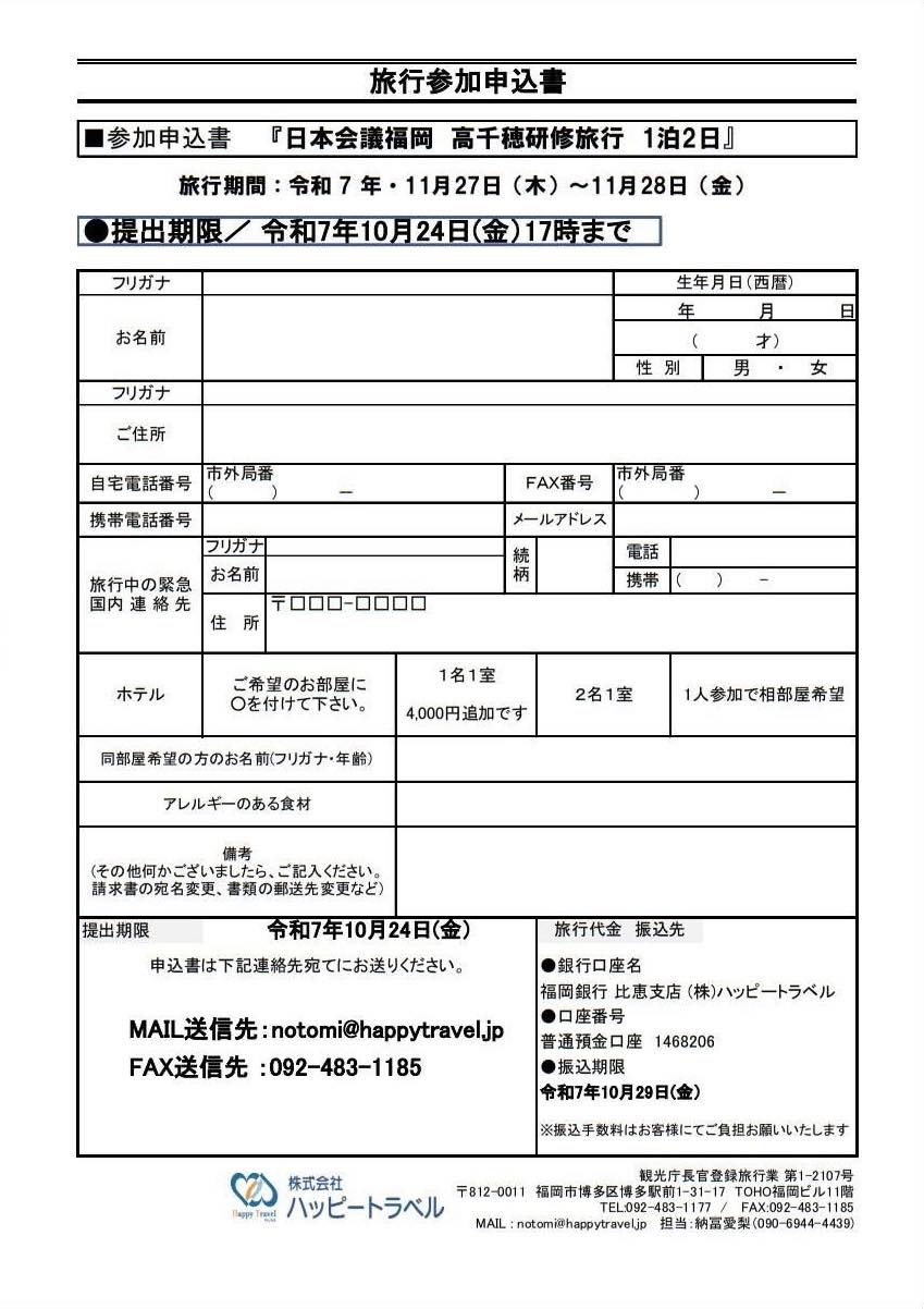 日本会議福岡 高千穂研修旅行県本部神話に宿る日本の心、国の礎 高千穂天岩戸、天安河原、くしふるの峰など神話の舞台と伝えられる地や神々を祀る神社が数多くある「神話の里」へ行事概要日時令和7年11月27日(木)・28日(金)会場 宮崎県 天の安河原見学、天岩戸神社参拝...ほか参加費1拍2日65,000円/貸し切りバス、ホテル、食事、観光地拝観料を含みます主催日本会議福岡お申し込み方法 用紙でのお申し込み Eメールでのお申し込み 電話でのお申し込み:092-483-1177 (納富) 閉じる